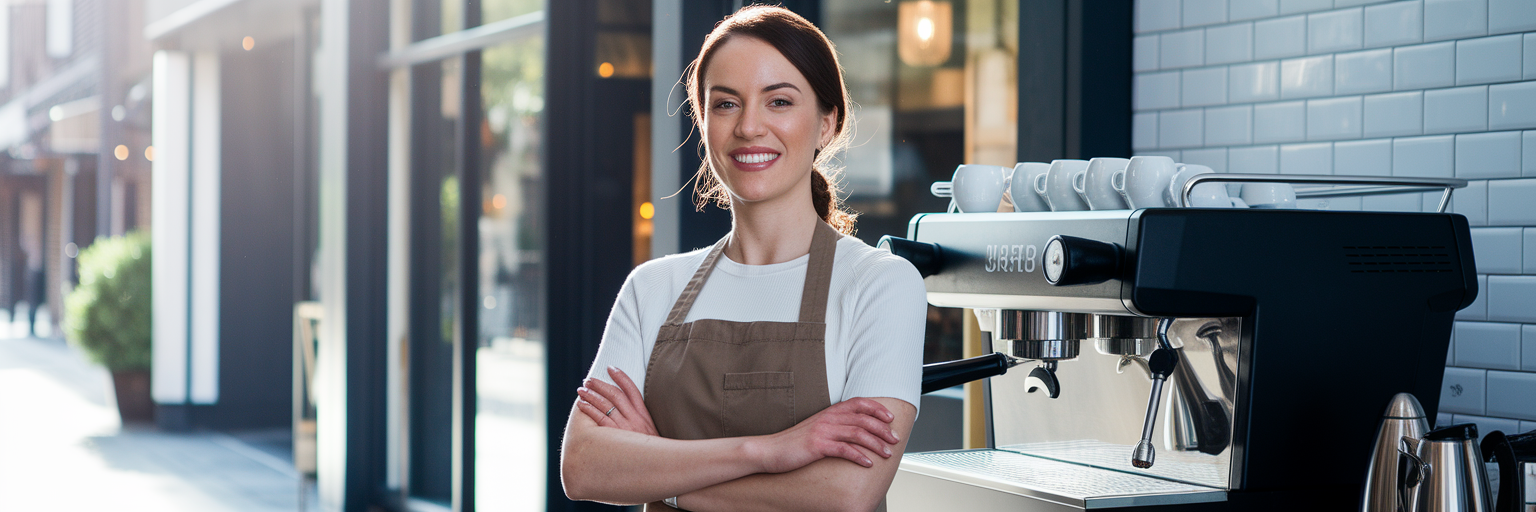Cafe owner smiling beside new coffee machine.